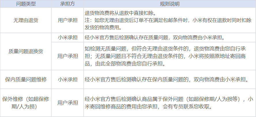 商品通过上门取件方式(含到家服务)返回至小米时,具体费用收取标准如下: