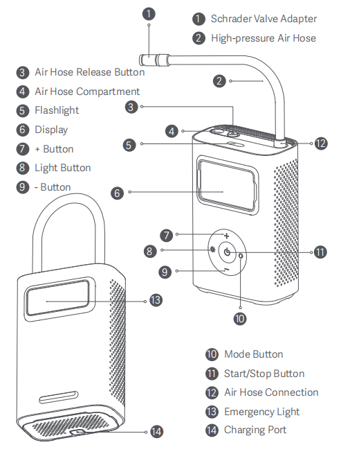 6. Q: What are the buttons and components of the Xiaomi Portable Electric Air Compressor 2 Pro? A: For your reference, the buttons and components of the Xiaomi Portable Electric Air Compressor 2 Pro are as follows: