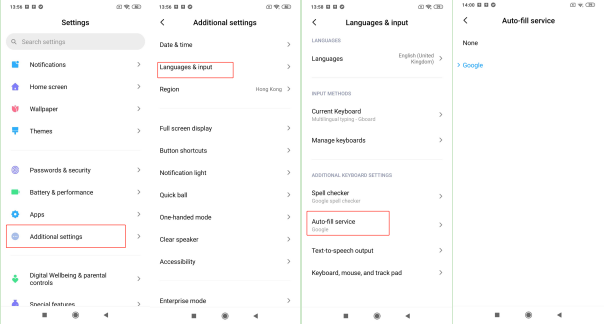 Método de configuración específico: Configuración>> Configuración adicional>> Servicio de idioma y entrada>>Autocompletar.