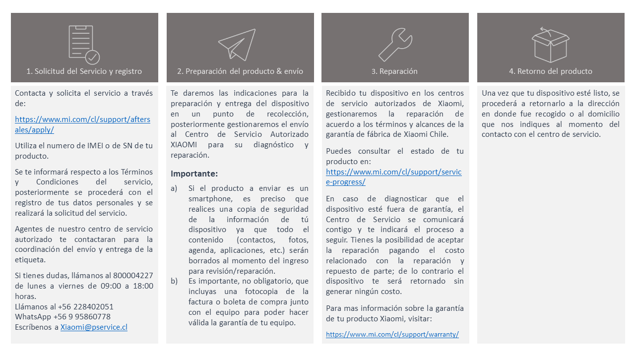 Si tienes dudas, llámanos al 800004227 de lunes a viernes de 09:00 a 18:00 horas. Escríbenos a través de WhatsApp al +56 9 95860778, también puedes enviar un correo electrónico a Xiaomi@pservice.cl