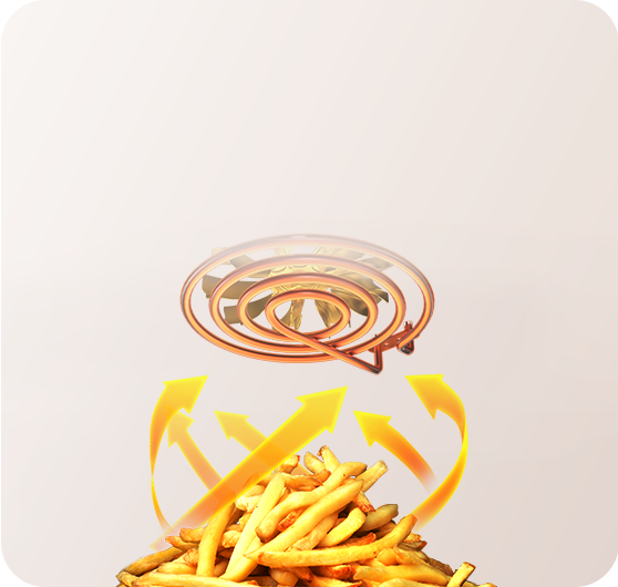 Las aspas espirales de doble aleta y la placa de fritura 3D tipo ciclón generan convección 360° para que la comida quede uniforme sin tener que voltear.