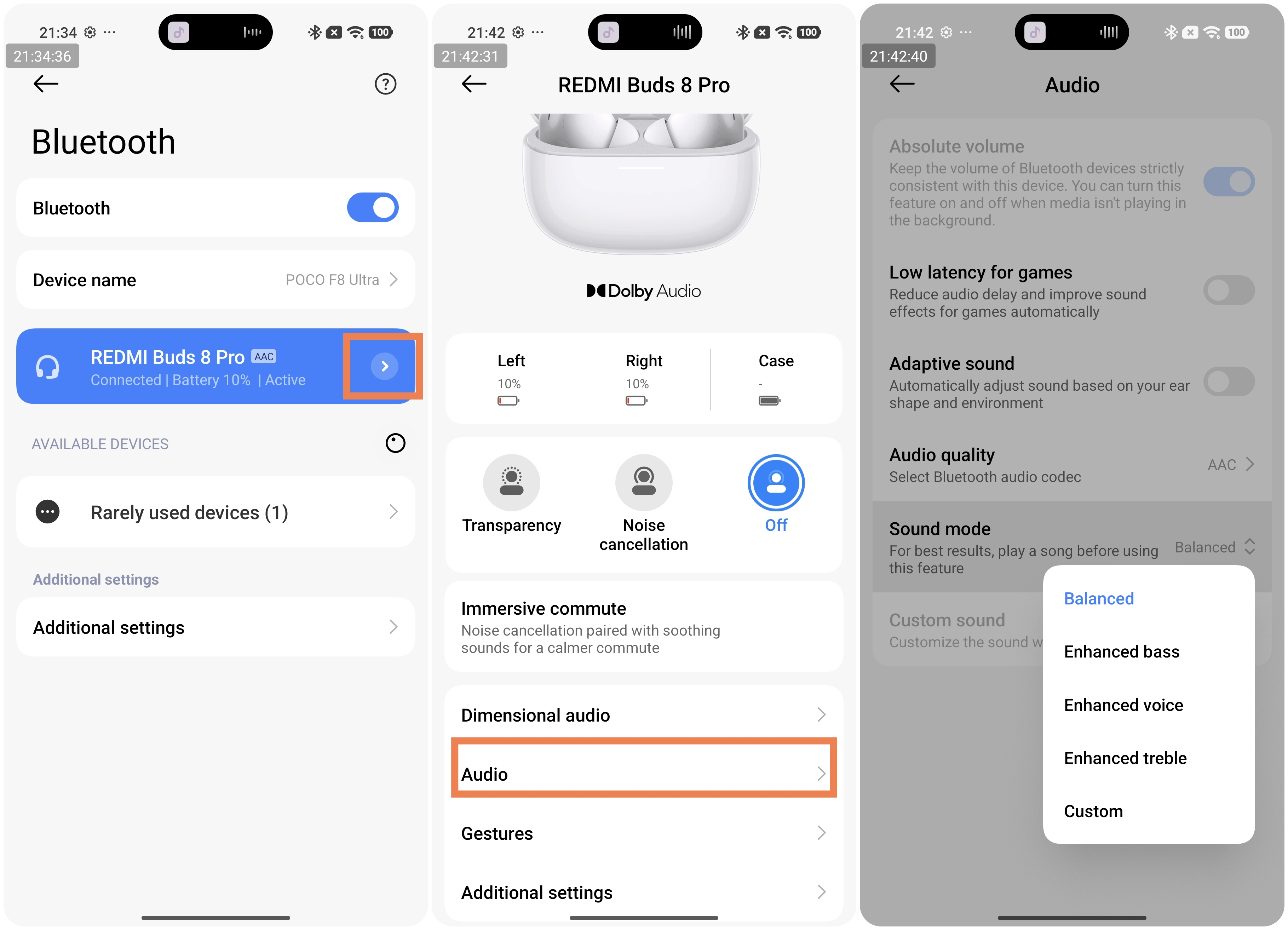 2. Por favor, confirma que [Volumen absoluto] está activado en tu teléfono. En los teléfonos Xiaomi, ve a la lista de dispositivos Bluetooth >> toca el ícono [>] junto a los REDMI Buds 8 Pro >> selecciona [Audio] >> activa [Volumen absoluto].