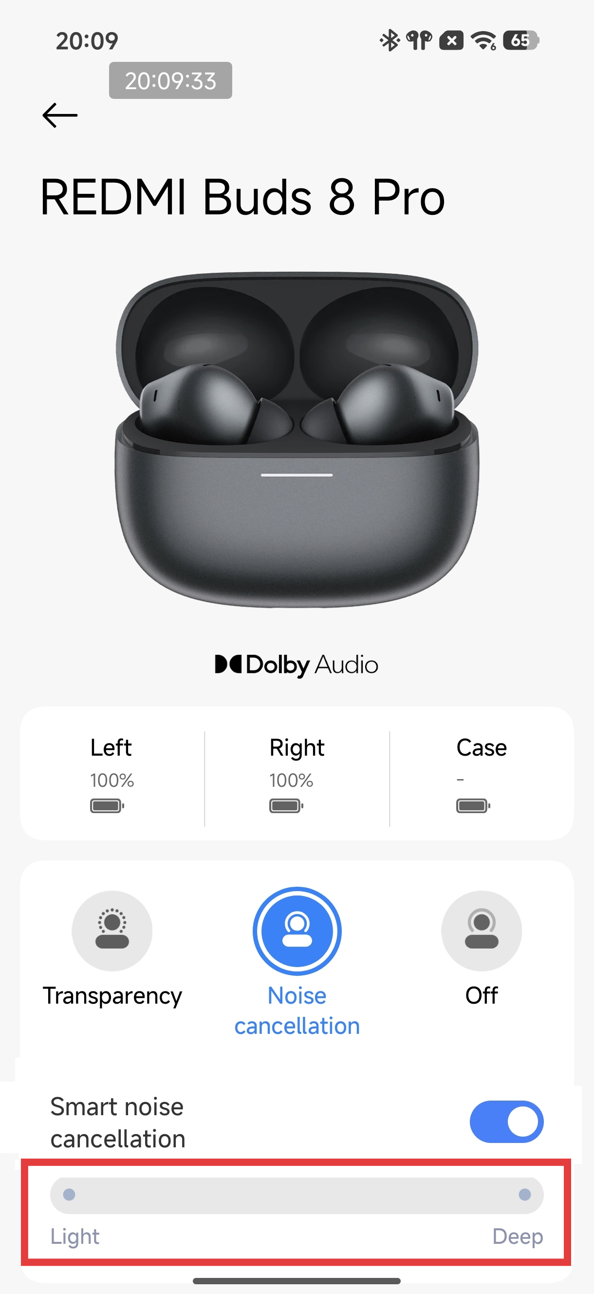 2. Vuelve a ponerte correctamente los REDMI Buds 8 Pro o cambia a almohadillas que se ajusten mejor a tu canal auditivo para reducir las fugas de sonido. Luego desactiva la cancelación de ruido inteligente y actívala de nuevo para conseguir un mejor efecto de cancelación de ruido.