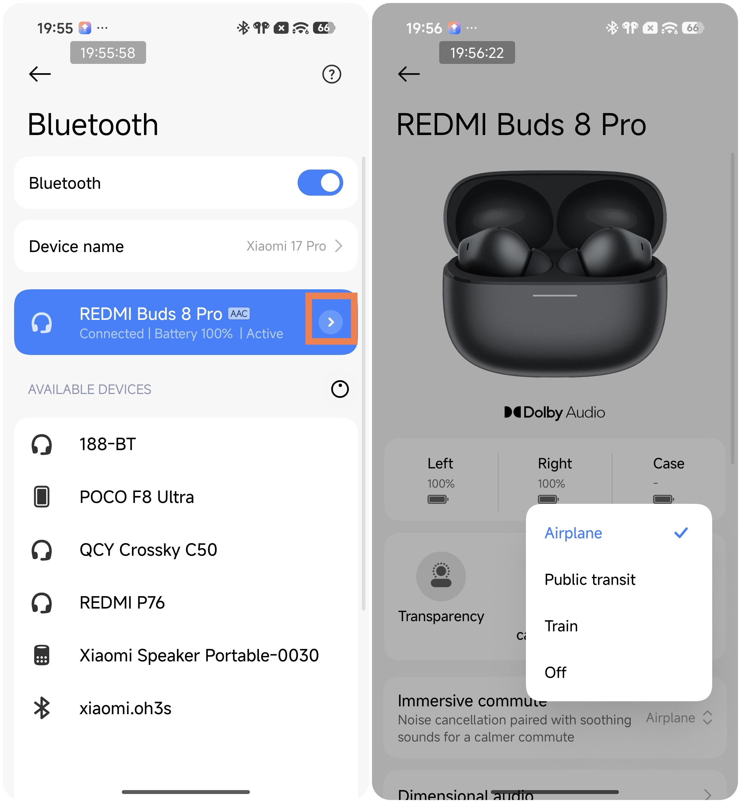 R: En un teléfono Xiaomi, ve a [Ajustes] >> [Bluetooth] >> toca el icono [>] en el lado derecho de [REDMI Buds 8 Pro] >> ponte los auriculares y toca [Desplazamiento inmersivo] >> elige [Avión], [Transporte público], [Tren] y [Desactivado].