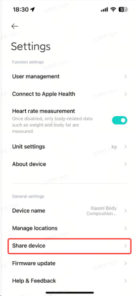 2. Seleccione Xiaomi Body Composition Scale S400 en la aplicación Mi Home/Xiaomi Home >> Configuración en la esquina superior derecha >> Share device >> y elimine los usuarios que comparten con poca frecuencia en la página del dispositivo seleccionado.