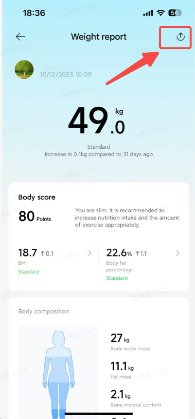 R: Abra la aplicación Mi Home/Xiaomi Home >> Ver informe >> Compartir en la esquina superior derecha.