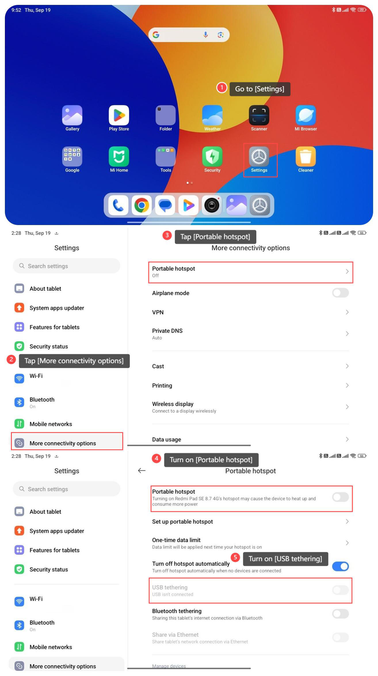 Para compartir el punto de acceso de su tableta a través de USB, consulte los siguientes pasos: