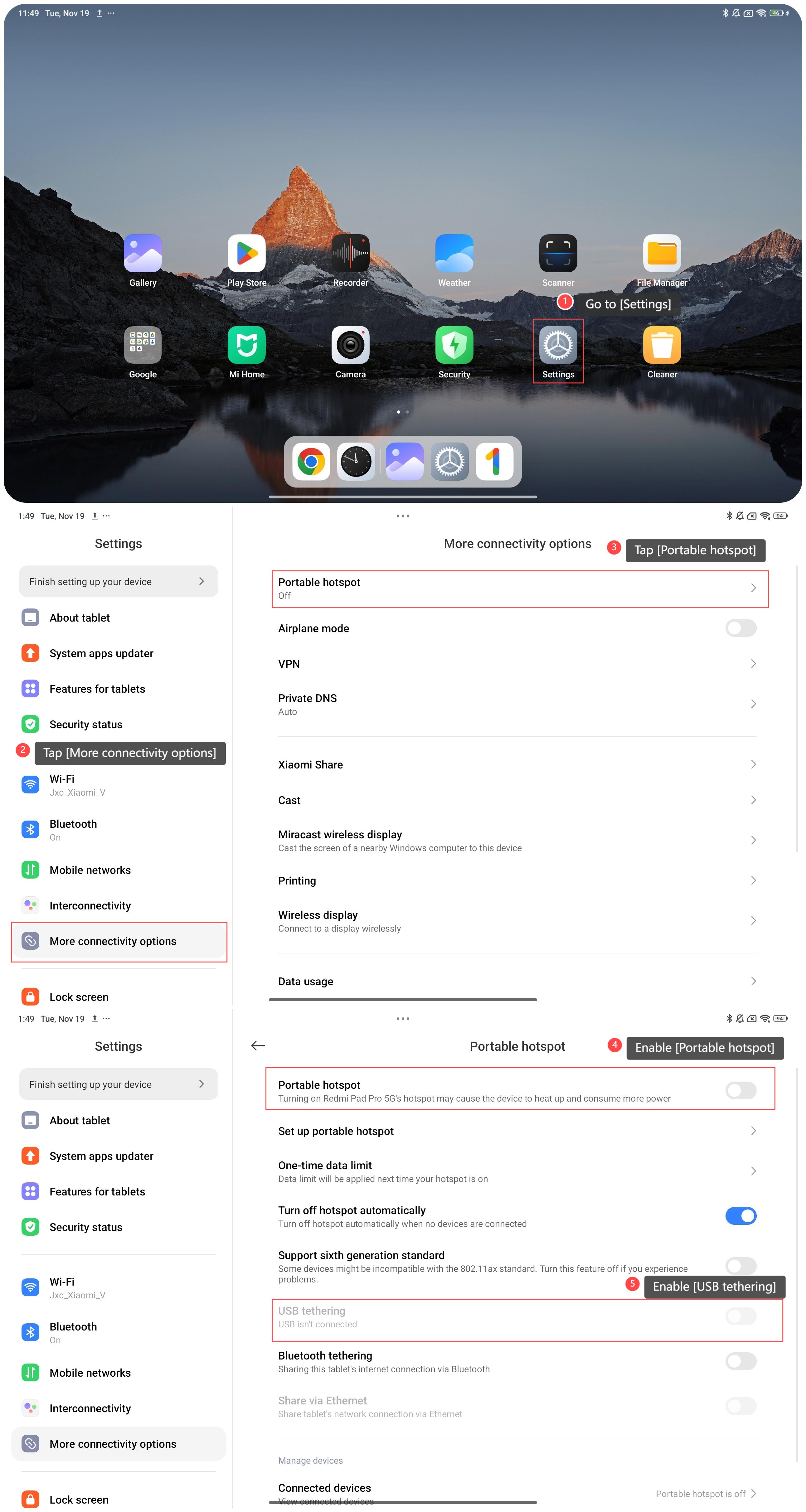 La Redmi Pad Pro 5G admite compartir el punto de acceso a través de USB. El anclaje a red USB proporciona una conexión a Internet más estable y fiable en comparación con el anclaje inalámbrico, lo que reduce las posibles interferencias. Ofrece velocidades de transferencia de datos más rápidas, lo que lo hace ideal para actividades que requieren un gran ancho de banda.