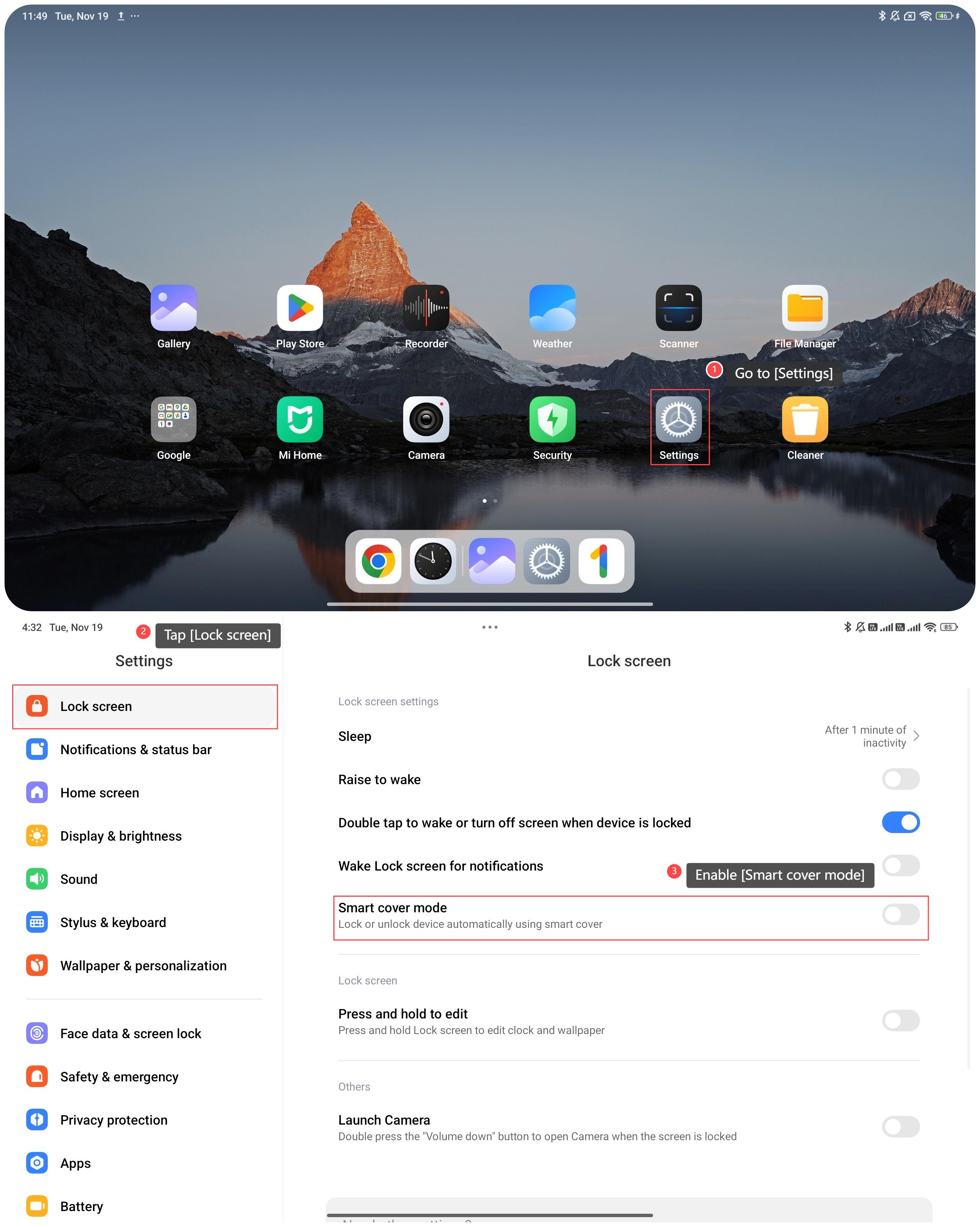 3. Habilite [Modo de cubierta inteligente] y el dispositivo se bloqueará o desbloqueará automáticamente con una cubierta inteligente.