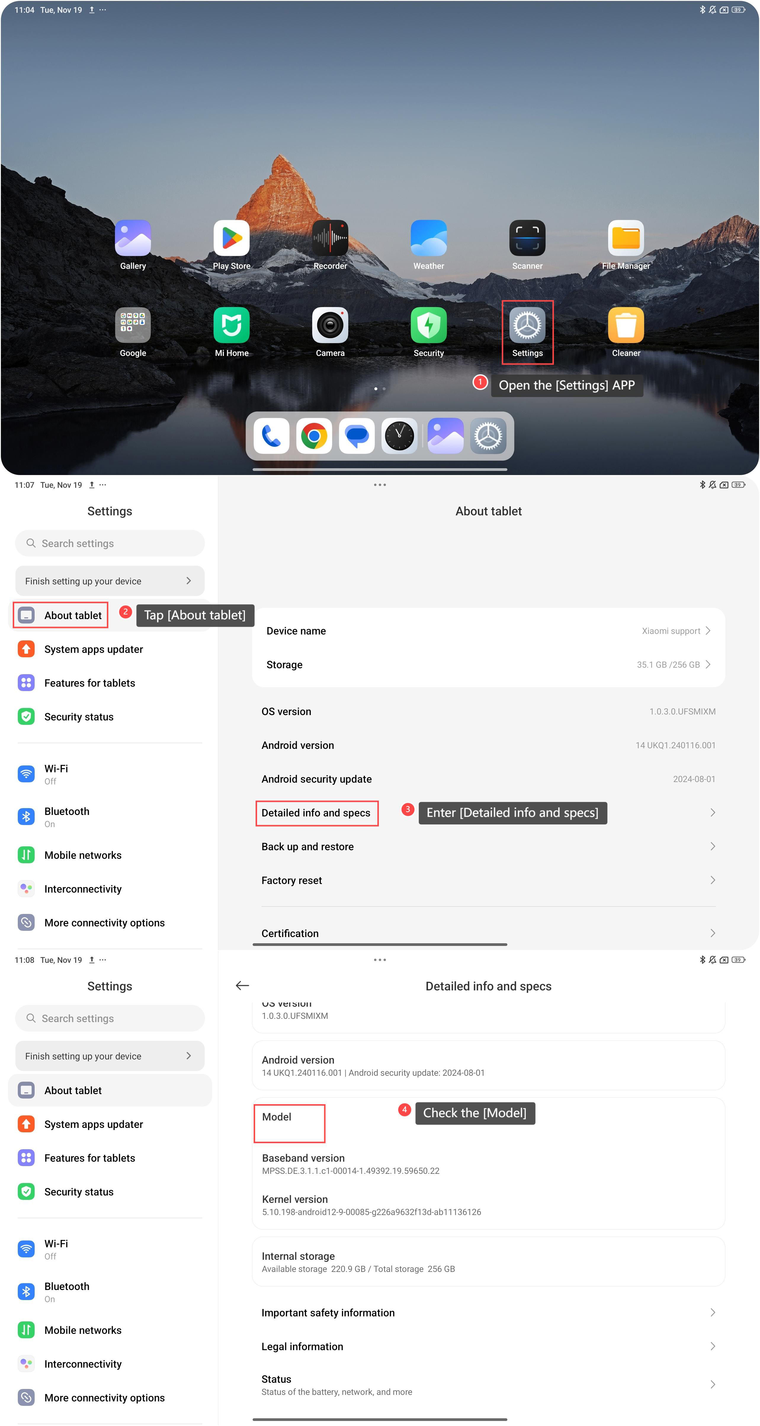 4. Desplácese hacia abajo ypodrá verificar el [Modelo] de su tableta.