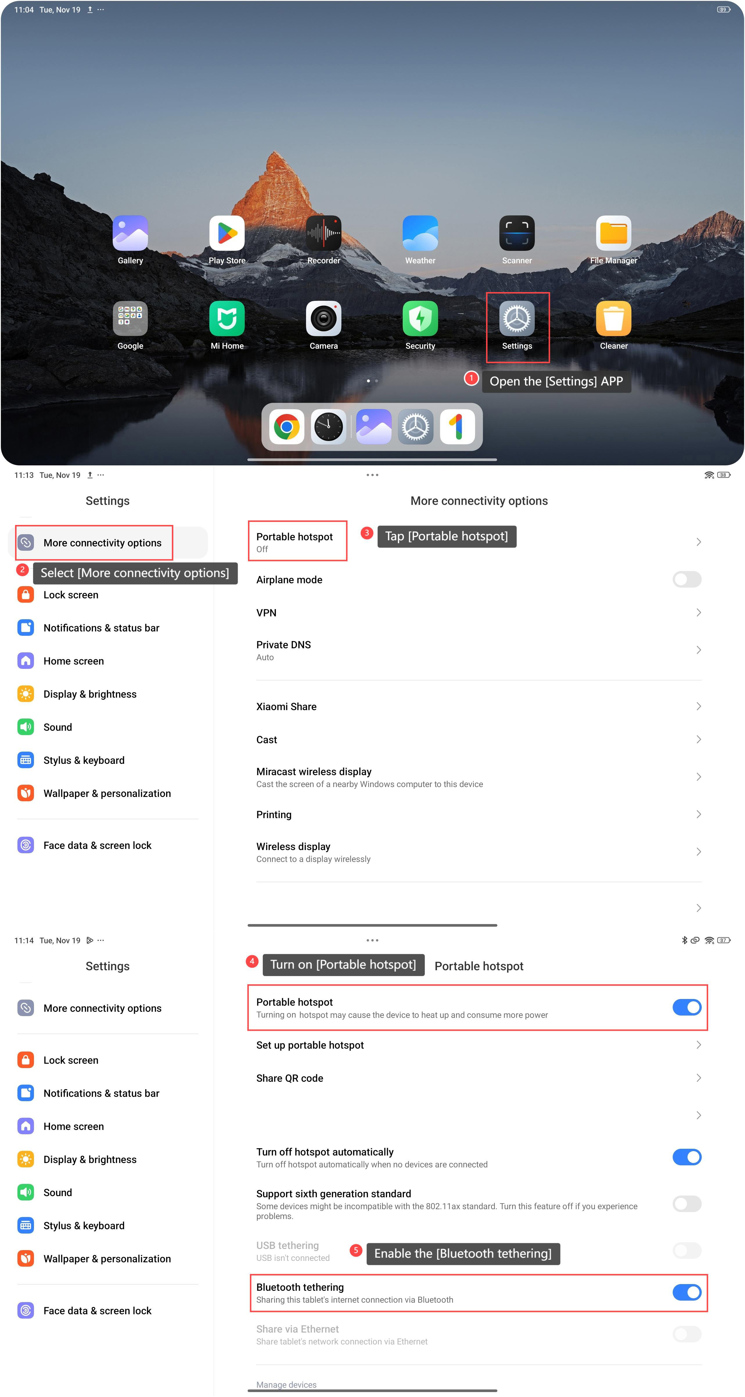 Compartir el punto de acceso de la Redmi Pad Pro a través de Bluetooth le permite compartir la conexión a Internet de su tableta con otros dispositivos mediante el anclaje a red Bluetooth. Esto significa que puede conectar otros dispositivos, como teléfonos inteligentes o computadoras portátiles, a Internet emparejándolos con su tableta.
