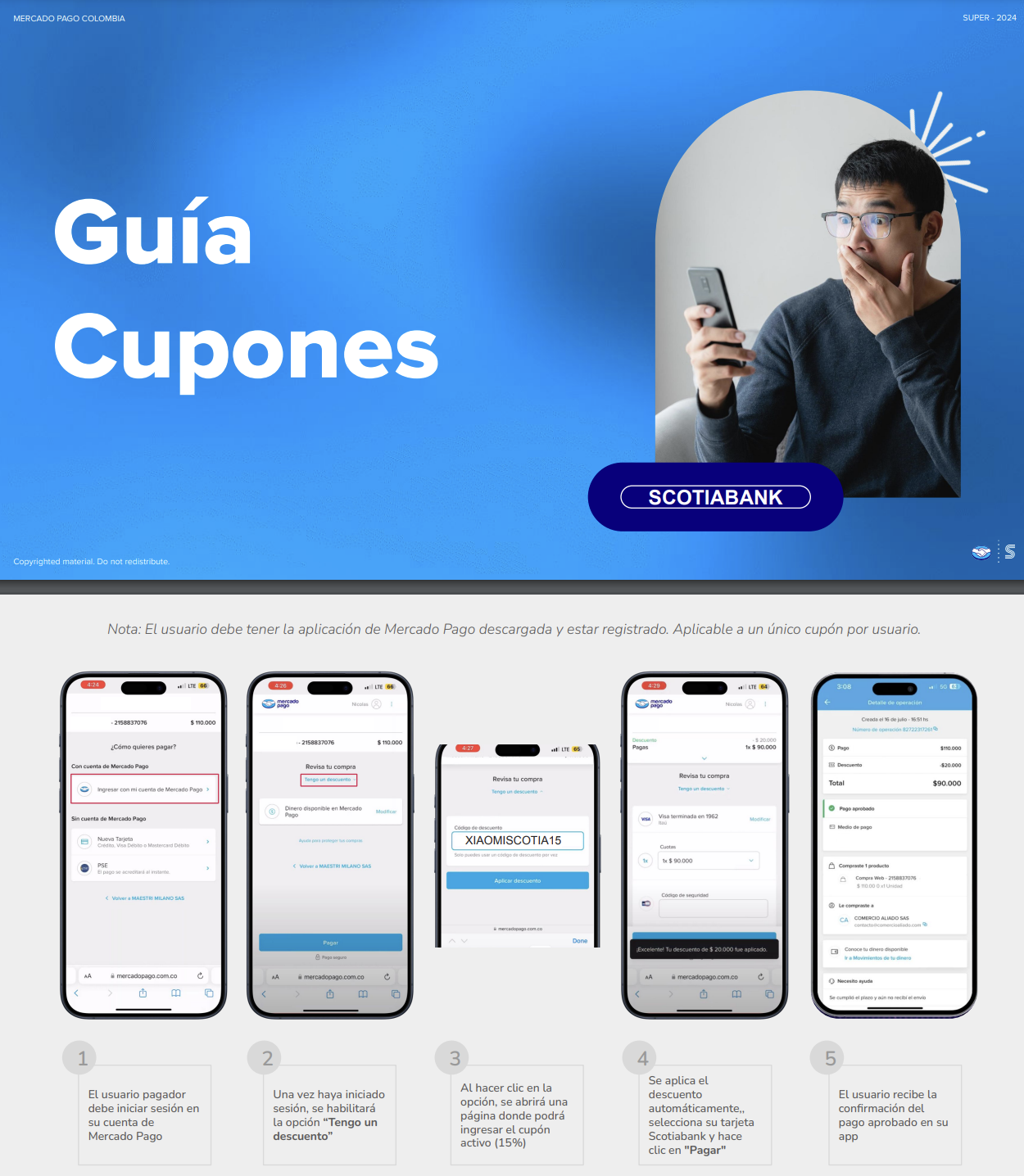 Reciba un cupón de descuento del 15% sobre el valor de su compra en compras mínimas de seiscientos mil (600.000 m/cte), pagando la totalidad de la compra únicamente con las Tarjetas crédito y débito de Scotiabank Colpatria. Lo anterior, utilizando el cupón XIAOMISCOTIA15. Oferta válida desde las 00:00hrs. del 26 de noviembre de 2024 hasta las 23:59hrs. del 8 de diciembre de 2024 o hasta agotar el presupuesto de veinte millones (20.000.000 m/cte), lo que primero ocurra, en caso de agotarse el presupuesto antes de la vigencia, se suspenderá la campaña y se informará a los usuarios por este medio. Son 100 cupones de descuento a nivel nacional, los cupones de descuento no son acumulables. Cada cupón es aplicable para una compra y tendrán un tope de descuento de doscientos mil (COP 200.000) sobre el valor total de su compra según el(los) precio(s) anunciado(s). El usuario deberá procesar el pago a través de Mercado Pago y podrá hacer uso del cupón de descuento máximo 1 vez en compras diferentes, siempre que éstas se realicen dentro de la vigencia de la actividad y sujeto a la disponibilidad de los cupones. Aplica únicamente con el cupón XIAOMISCOTIA15 y para los productos publicados en la siguiente URL: https://www.mi.com/co/. El cupón se hará efectivo al momento de ingresarlo en la página web de XIAOMI al momento de realizar el pago y siempre y cuando la respectiva compra sea pagada con una tarjeta de débito o crédito Scotiabank Colpatria. El cupón es personal, no es canjeable por efectivo u otros bienes y/o servicios, ni acumulable con otras promociones, ofertas o cupones activos en la página. Aplica para la compra de varios productos en Carrito de Compra. El descuento se aplicará en el momento de finalización de la transacción una vez el usuario haya ingresado el cupón de descuento en el flujo de pago de la página web de XIAOMI. Todas las imágenes son de referencia. No aplica para tarjetas Codensa. Para conocer tasas, condiciones y tarifas consulte con su entidad bancaria. Mercado Pago Colombia exclusivamente actúa como procesador de pagos y por ello no será responsable respecto de la existencia, calidad, cantidad, estado, integridad o legitimidad de los bienes ofrecidos, adquiridos o enajenados por los usuarios de XIAOMI. Aplican los términos y condiciones del uso de Mercado Pago Colombia alojados en la URL: https://www.mercadopago.com.co/ayuda/terminos-y-condiciones_299. Beneficio válido únicamente en el territorio de la República de Colombia.