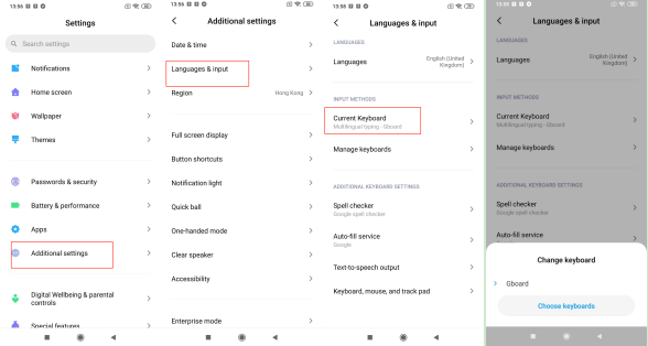 Specifická metoda nastavení: Nastavení>> Další nastavení>> Jazyk a vstup>>Aktuální klávesnice.