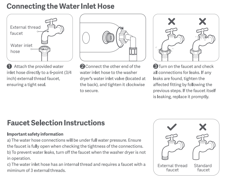 (1) Schließen Sie den mitgelieferten Wassereinlaufschlauch direkt an einen 6-Punkt-(3/4 Zoll) Außengewindehahn an, um eine dichte Abdichtung sicherzustellen.