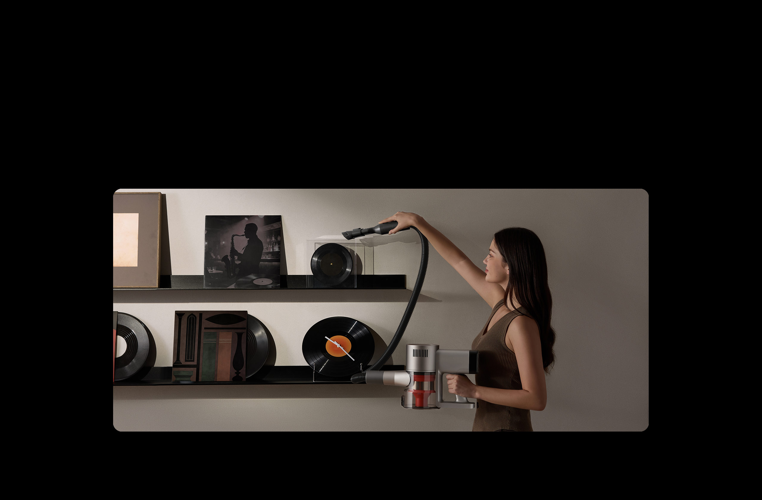 Grâce au suceur brosse 2-en-1, l'angle de la tête d'aspiration s'ajuste librement pour une plus grande flexibilité de nettoyage des cadres photo, des meubles, des rebords de fenêtre et autres surfaces.