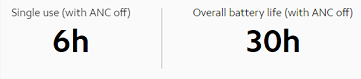 | Autonomie de la batterie des écouteurs pour une utilisation unique : Environ 6 heures (avec l'annulation active du bruit désactivée) | |