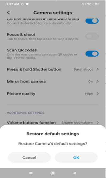 Lorsque les paramètres de l'appareil photo sont accessibles, effacez les données de l'appareil, restaurez les paramètres par défaut (comme indiqué dans l'illustration ci-dessous) et réessayez,