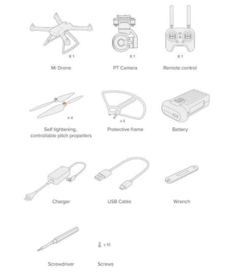 4. Q : Quelle est la taille du Mi Drone ? R : Le châssis du Mi Drone est pliable, sa taille après expansion est 310 mm(L)*380 mm(l)*182 mm(H). La taille après installation de l'hélice est 540mm(L)*610mm(l)*182 mm(H). La taille après démontage de toutes les pièces et pliage est 310 mm(L)*380 mm(l)*78 mm(H). 5. Q : Quel est le contenu de l'emballage du Mi Drone ? R : Le contenu de l'emballage du Mi Drone se présente comme indiqué ci-dessous :