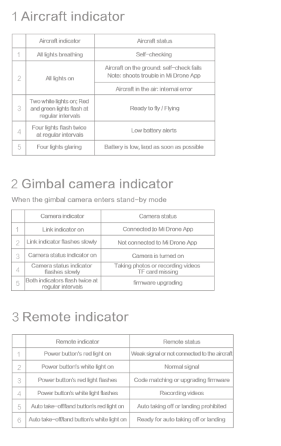 11. Q : Comment lancer le Mi Drone ? R : Le drone s'auto-contrôle chaque fois qu'il est allumé. Lorsque l'auto-contrôle échoue, une notification sera envoyée dans votre Appli. 14. Q : Quelle est la signification des indicateurs de l'appareil, de la caméra et de la télécommande ? R :