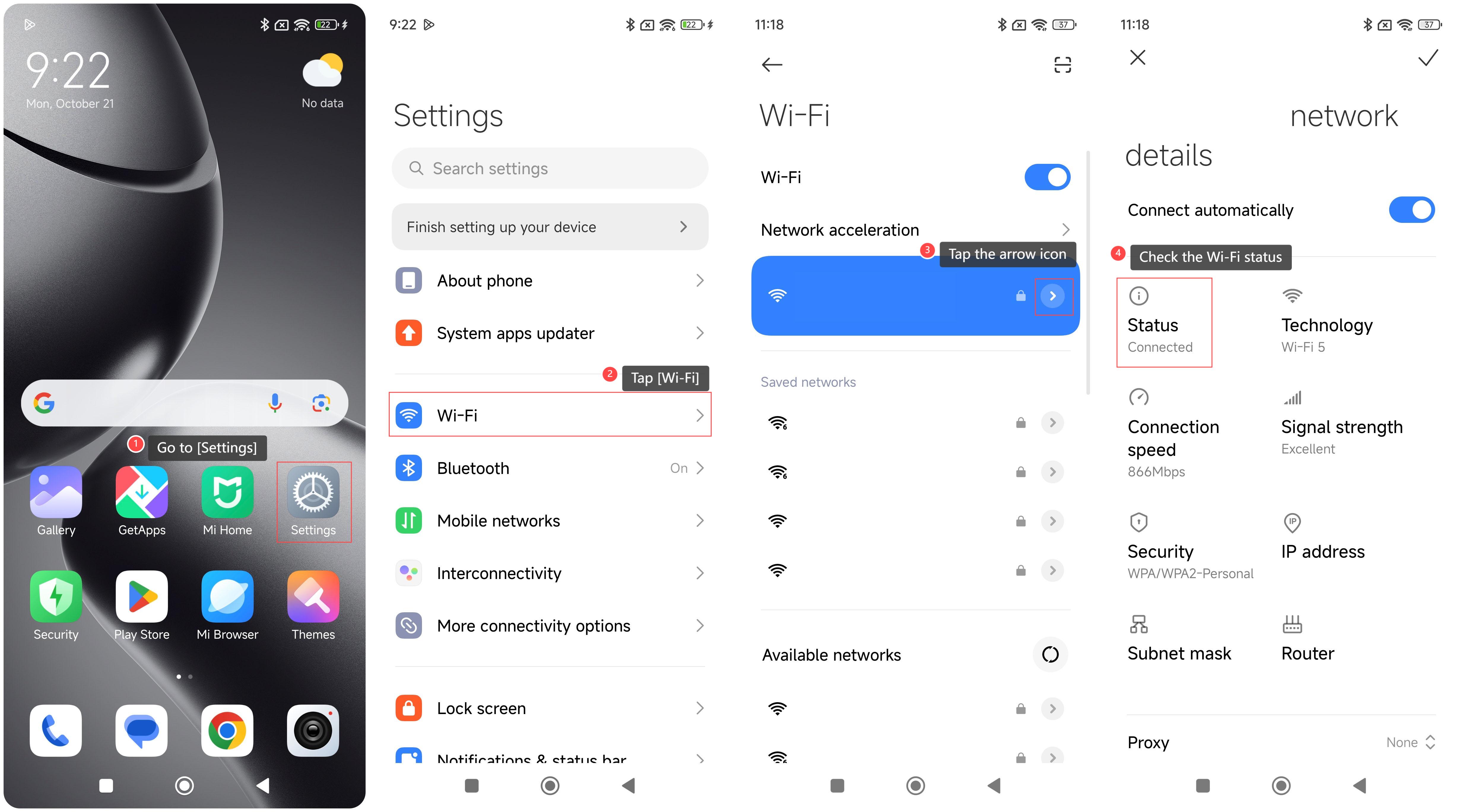3. Appuyez sur l'icône de la flèche sur le côté droit du Wi-Fi que vous souhaitez vérifier ;