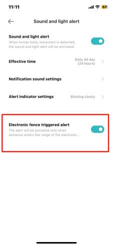 12. Activez [Alerte de clôture électronique déclenchée]. Ce commutateur est désactivé par défaut. Il entrera dans l'interface des paramètres déclenchés par la clôture électronique lorsque vous l'activerez.