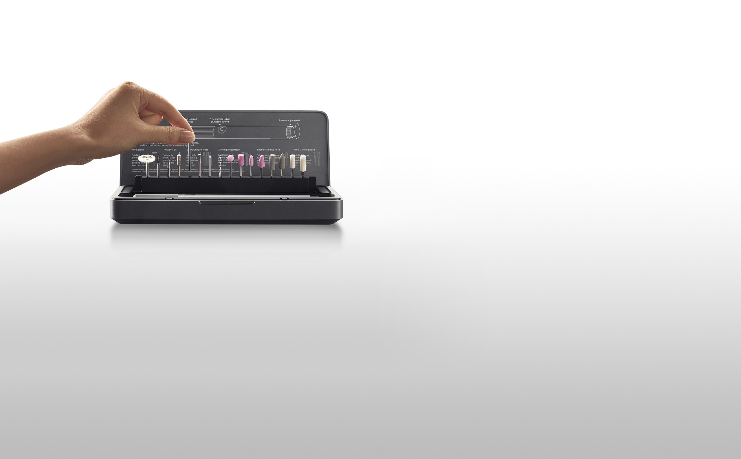 Includes 16 high-quality grinding bits with 2.35mm shanks. When you open the case, they automatically pop up, allowing easy access.6