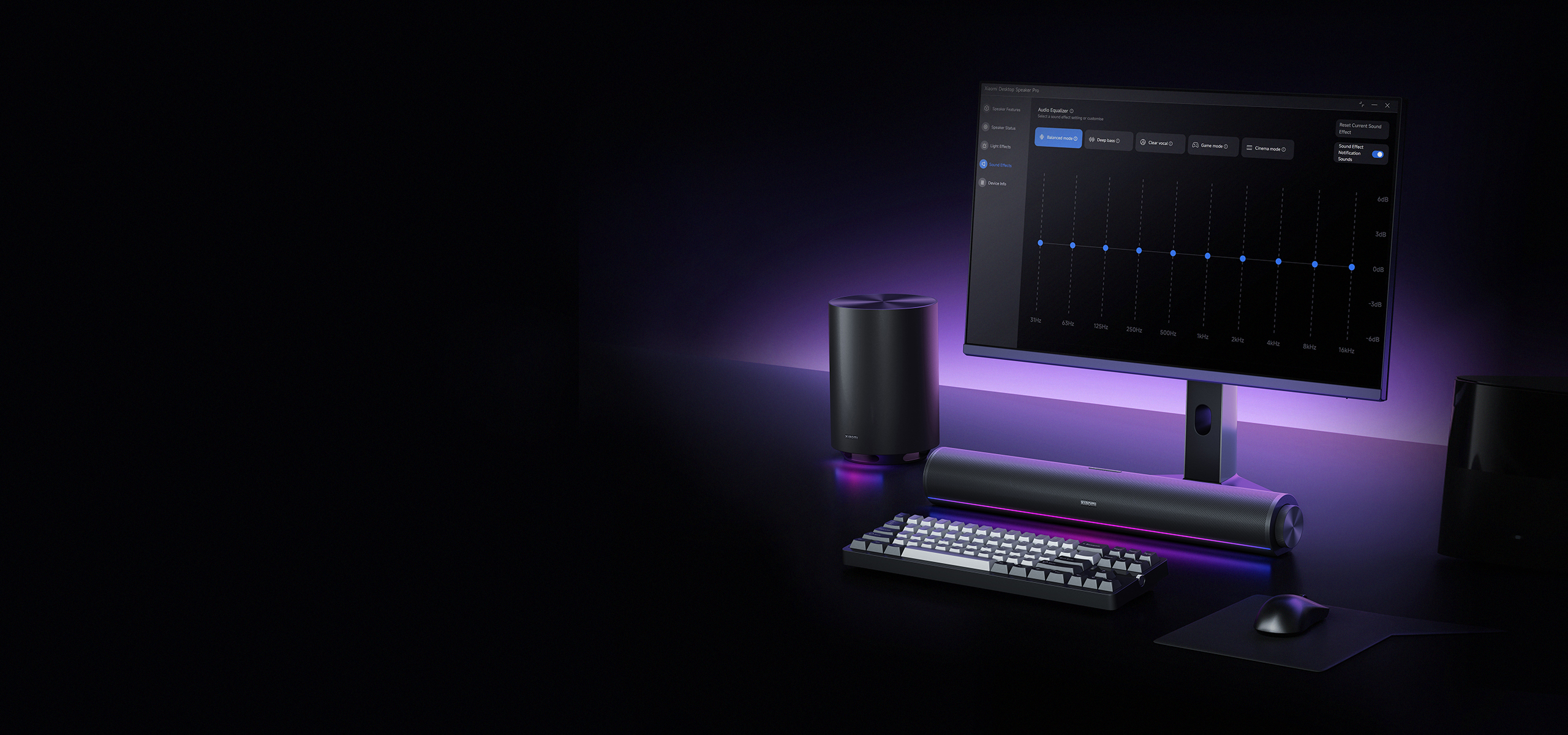 24 RGB LEDs are embedded in the main speaker, complemented by 5 RGB LEDs in the wireless subwoofer. Select from six newly designed lighting effects to create a vibrant and dynamic visual experience that brings your desktop to life.