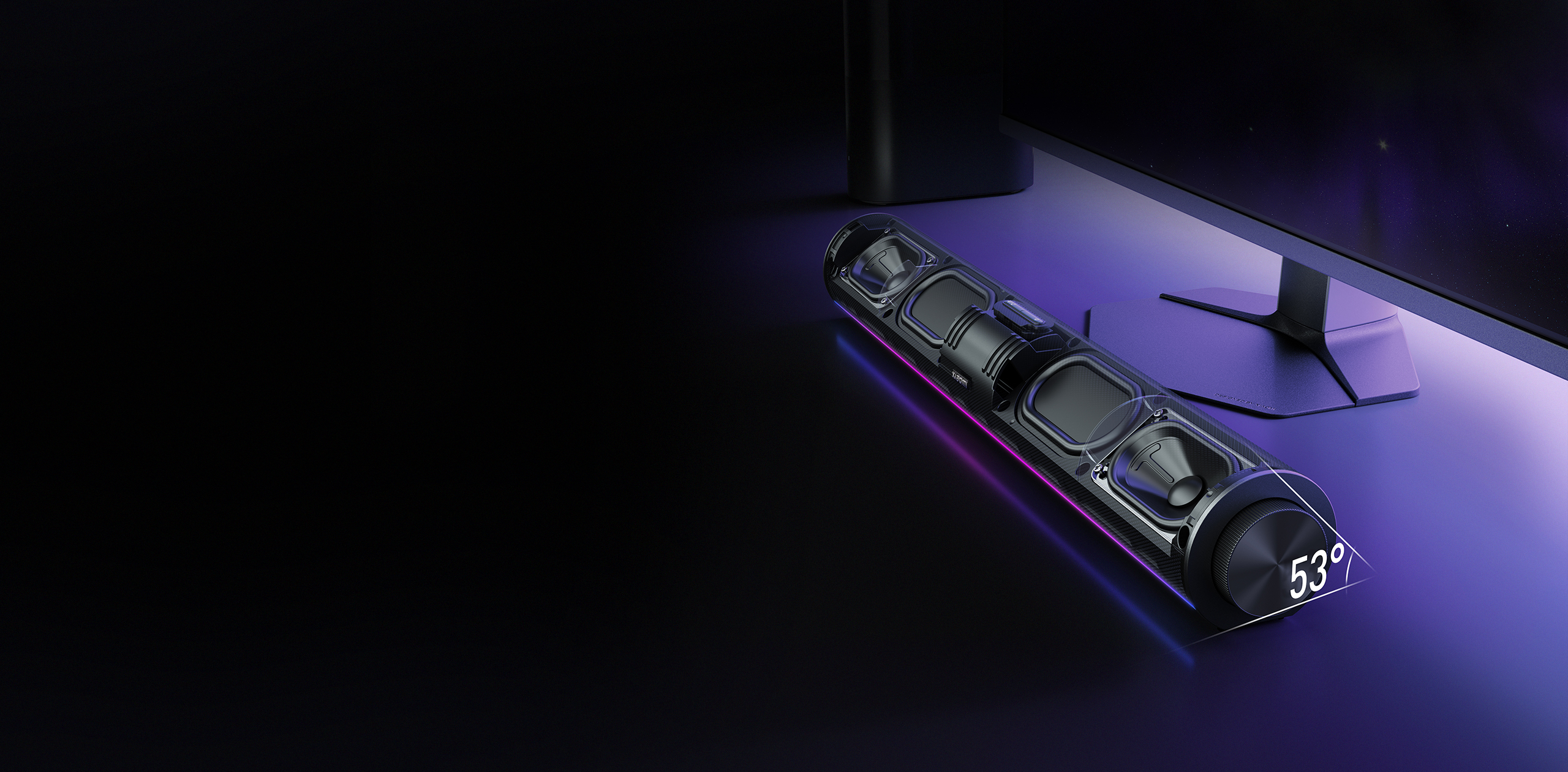 The main speaker's 53° upward tilt is designed to match natural desktop listening positions. The classic overhead soundstage design delivers a wider, more even audio spread, redefining the desktop listening experience.1