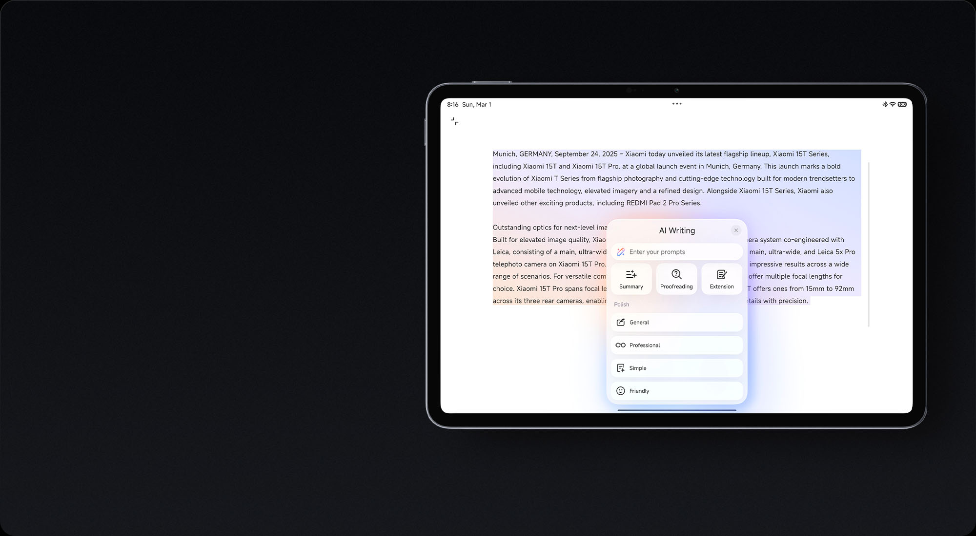 1. 3.2K refers to the resolution of 3200 x 2136.2. Availability of AI features may vary by region. Please check your local website for more information.3. Data tested by Xiaomi Internal Labs. Thickness measurement does not include the protrusion of the lens module. Actual values may vary due to differences in test environments, test software and other factors.4. For Xiaomi Pad 8 Pro: The standard version has a thickness of 5.75mm and a weight of 485g; the matte glass version has a thickness of 5.80mm and a weight of 494g.5. 9200mAh is the typical capacity; the rated capacity is 9000mAh.6. Data tested by Xiaomi Internal Labs, actual results may vary.7. No power adapter included in box. 67W power adapter sold separately. Using Xiaomi 67W power adapter is recommended.8. The screen size of Xiaomi Pad 8 Pro is about 11.2" in the full rectangle when measured diagonally. Actual viewable area is less due to the curved corner design and measurements between individual products may vary.9. Data comes from Xiaomi Internal Labs. Actual results may vary.10. The screen supports a maximum refresh rate of up to 144Hz. Actual refresh rates may vary depending on the application interface and game visual settings. Please refer to the actual experience.11. Matte glass version sold separately. Please refer to the actual product for details.12. Data comes from Xiaomi Internal Labs. Actual results may vary due to differences in test environments or conditions. Please refer to the actual product.13. The reduction in screen reflectivity is compared with Xiaomi Pad 8 Pro.14. The improvement in glare resistance is compared with Xiaomi Pad 7 Pro matte glass version.15. Data tested by Xiaomi Internal Labs, 200% volume boost refers to 16 levels of volume compared to 15 levels, and actual effects may vary due to software and scenarios, please refer to the actual use.16. Data tested by Xiaomi Internal Labs. Comparisons were made with Xiaomi Pad 7 Pro: CPU performance was measured using Geekbench 6 (Multi-Core), and GPU performance using 1440P Aztec Ruins Vulkan.17. Data tested by Xiaomi Internal Labs using AnTuTu V11. Actual results may vary due to differences in test environments or conditions. Please refer to the actual product.18. Interface visuals are AI-generated and may differ from the actual UI.19. Xiaomi HyperAI is available in select regions, languages, and device models. Works on compatible apps and surfaces. Internet connection required, always check responses for accuracy. Please check your local official website for more information.20. AI Art is available in select languages and device models. Availability may vary based on region and model. Internet connection required. Check responses for accuracy.21. Visuals and results for illustrative purposes and may vary.22. AI Writing is available in select regions, languages, and device models. Works on compatible apps and surfaces. Internet connection required. Check responses for accuracy.23. Visuals and results for illustrative purposes and may vary.24. AI Translate Conversation is available in select regions, languages, and device models. Check responses for accuracy.25. Visuals and results for illustrative purposes and may vary.26. AI Calculator is available in select device models. Supports coefficient balancing for equations but does not generate chemical symbols. Check responses for accuracy.27. The PC-level browser will begin rolling out via OTA in certain regions at the end of February 2026.28. The WPS Office PC is only available in certain regions, and will begin to be rolled out via OTA in certain regions at the end of March 2026. The current version only supports input in English, Simplified Chinese, and Traditional Chinese. Language support is provided by third-party applications.29. Visual for compatibility demonstration purposes only, Xiaomi HyperOS 3 is not endorsed, sponsored, or affiliated with Apple Inc. in any way. Apple, iOS, macOS, iPadOS, Touch ID, Face ID, MacBook, iPhone, and iPad are registered trademarks of Apple Inc..30. Tablets must to be upgraded to Xiaomi HyperOS 3 and logged into the same Xiaomi account, with Bluetooth, WLAN, and "Settings-Interconnectivity" enabled. Availability of specific features and services may vary depending on software version, apps, and device models, please refer to actual use. Apple devices need to have the latest version of "Xiaomi Interconnectivity" app installed from Xiaomi official website.31. Xiaomi Focus Pen Pro sold separately. Availability may vary by region.32. Xiaomi Focus Pen Pro is compatible with Xiaomi Pad 6S Pro 12.4, Xiaomi Pad 7 Series, and Xiaomi Pad 8 Series.33. Please note that the availability and release schedule of third-party software may vary by region and are determined solely by the third-party developer. Please refer to the Google Play in your region for availability updates.34. Accessories sold separately, availability may vary by regions.
