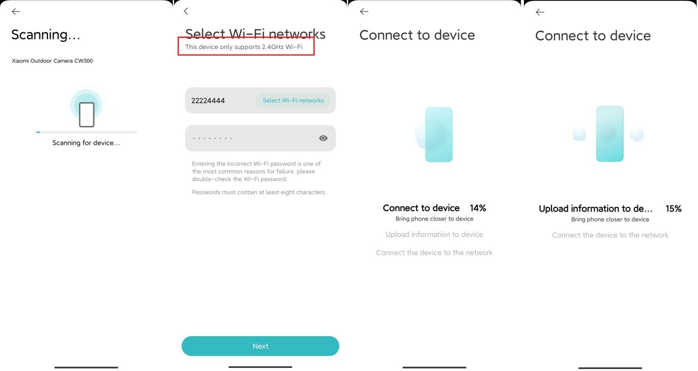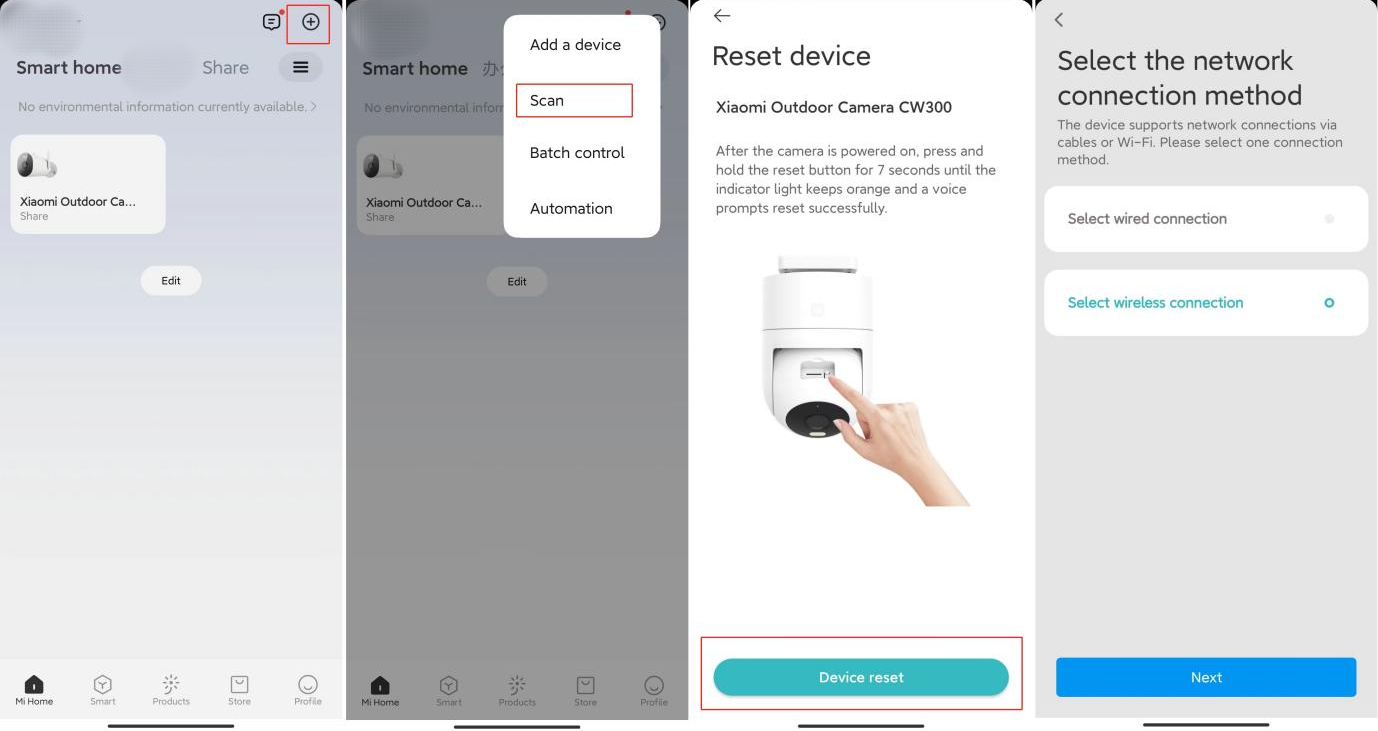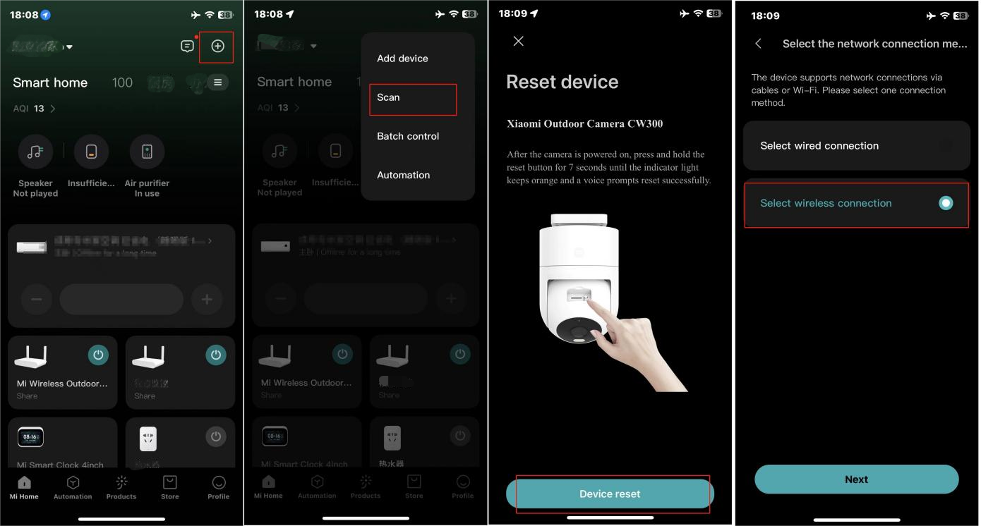 A: Mi Home App >> Tap [+] at the upper right corner >> Select [Add device] >> Select [Xiaomi Outdoor Camera CW300] or tap [magnifying glass] at the upper right corner to search "Xiaomi Outdoor Camera CW300" >> Select [Using Wi-Fi to connect] >> Select [Wi-Fi] >> [Keep the network connection] >> [Add manually if there is no QR code] >> Enter the 4-digit number broadcasted by the camera >> Wait for the binding to be successful.
