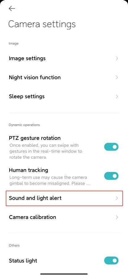 2. Tap [...] at the upper right corner of the camera's live video homepage, tap [Sound and light alert] in the camera settings, and turn on the [Sound and light alert] option to use it.