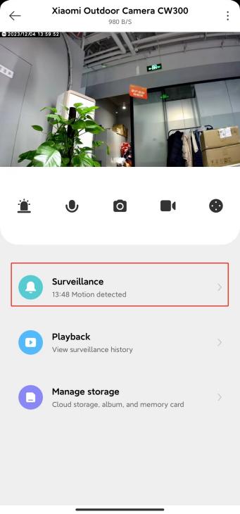 A: 1. Enter the Mi Home App, tap the video screen to view the real-time video; tap [Home surveillance] to view the video of events recorded by the camera in the past;