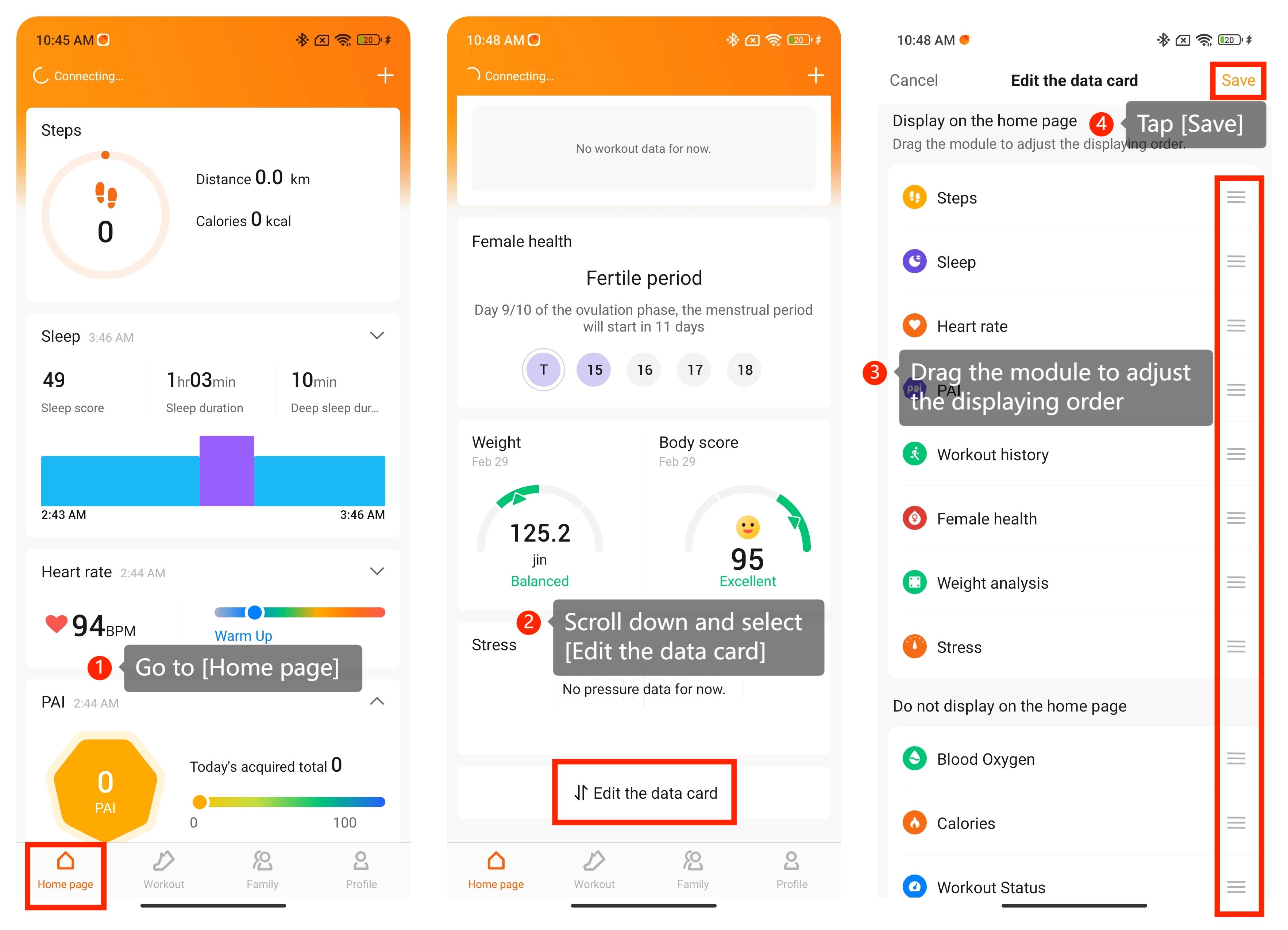 The Mi Smart Band 5 comes with the built-in feature of editing the data card on the Zepp Life App’s Home page to give you quick access to check your preferred features and meet your personalized requirements. To edit the data card in the Zepp Life App of your Mi Smart Band, please refer to the following steps: 1. Open the Zepp Life App and go to [Home page]; 2. Scroll down and select [Edit the data card]; 3. Drag the module to adjust the displaying order. You can use this feature to adjust the order of the displayed data card, hide your displayed data card, and add the hidden data card to the Home page; 4. Tap [Save] to save your changes.