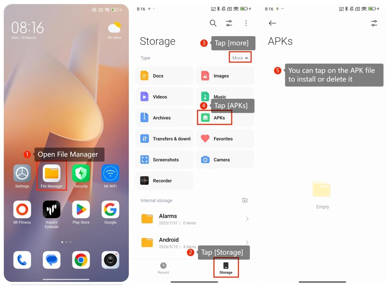 3. Tap [more] and then tap [APKs] to display the APK files, which usually have the ".apk" file extension;