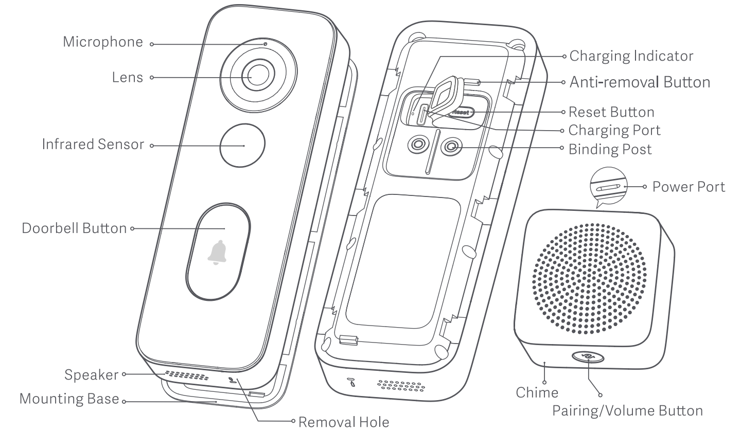 There is a Microphone, Lens, Infrared Sensor, Doorbell Button, Speaker, Mounting Base, Removal Hole, Charging Indicator, Anti-removal Button, Reset Button, Charging Port, and Binding Post.