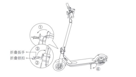23.Q: How does Xiaomi Electric Scooter 3 Lite unfold? A: 1. When opening, pull the folding hook to release it from the buckle. 2. Close the standpipe upward, confirm that the lower folding hook is adsorbed on the standpipe, lift the folding lock, and push the folding wrench inwards firmly.