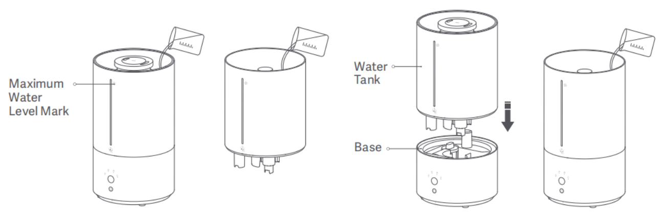 2. You can also remove the water tank and place it on a level surface, then open the water tank cover and add water. To reinstall the water tank, align the water level window with the power button and place the water tank onto the base. As well, you can open the water tank cover and add water directly without removing the water tank.