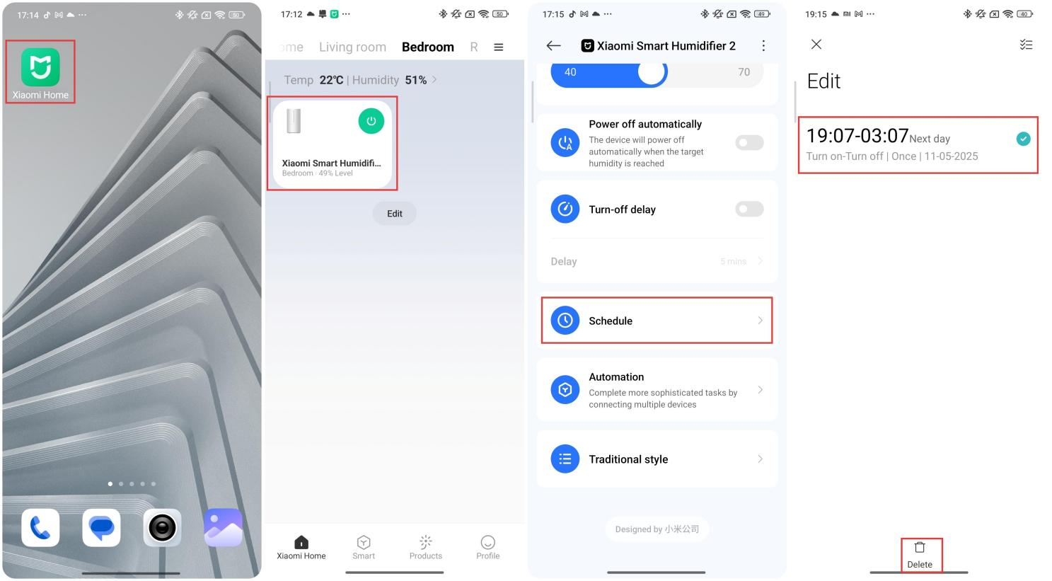 A: To set the On/Off Timer of the Xiaomi Smart Humidifier 2, please refer to the steps: