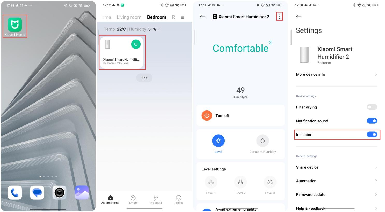 A: Turn the indicator on/off of the Xiaomi Smart Humidifier 2 via the Xiaomi Home App.