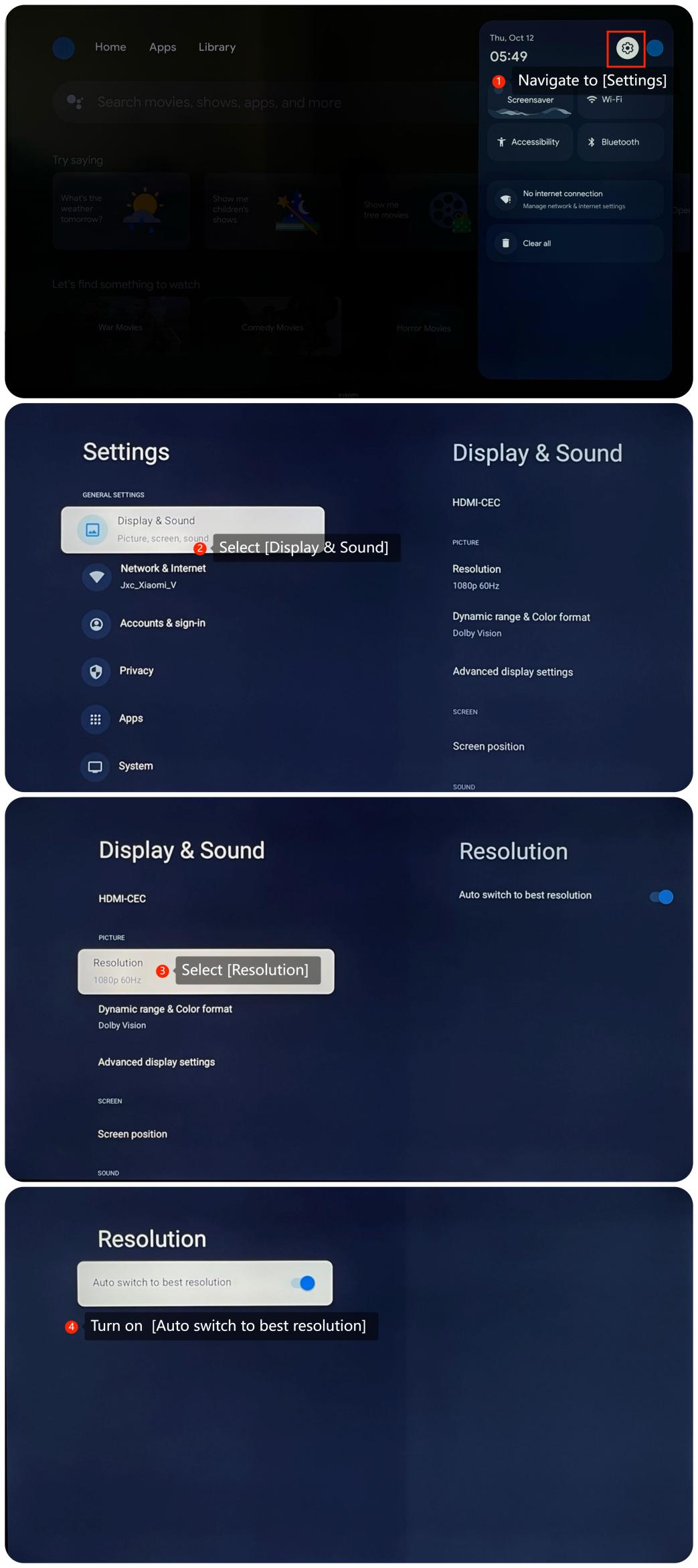 If the picture on your Xiaomi TV Box S (2nd Gen) does not match the screen, you can try the following troubleshooting steps: Scenario 1: If the issue only occurs when you are using a specific app, please refer to the following methods: 1. Ensure that the HDMI cable is firmly connected to both the Xiaomi TV Box S (2nd Gen) and the TV screen. If possible, use a different cable to eliminate the possibility of a faulty cable; 2. Turn off both your Xiaomi TV Box S (2nd Gen) and your TV, unplug them from the power source, wait for a minute, and then plug them back in and power them on; 3. If possible, connect the Xiaomi TV Box S (2nd Gen) to another TV to see if the issue persists. This can help determine whether the problem is with the Xiaomi TV Box S (2nd Gen) or the TV screen; 4. Ensure that the resolution settings on your Xiaomi TV Box S (2nd Gen) are compatible with your TV. You may need to adjust the resolution by navigating to [Settings] >> [Display & Sound] >> [Resolution] >> [Auto switch to best resolution]; 5. Check for updates for the app. An outdated app can cause issues; 6. If the issue persists, you can consider uninstalling and reinstalling the specific app; 7. Sometimes, system updates may resolve relative issues. You can check for system updates by going to [Settings]>>[System]>>[About] >> [System update].If it is the latest version, a message will appear on the screen indicating that your system is up to date; 8. As a last resort, you can try performing a factory reset by going to [Settings] >> [System] >> [About] >> [Reset]. Please note that the operation will erase all the data, so be sure to back up important information before proceeding. Scenario 2: If the issue occurs when you connect other storage devices to the Xiaomi TV Box S (2nd Gen) using the USB port and watch the contents inside, please refer to the following methods: 1. Ensure that the storage device is firmly connected to the Xiaomi TV Box S (2nd Gen). Check for physical damage on the USB port. If possible, use another storage device to see if the issue persists; 2. Unplug the storage device, wait for a minute, and then plug it back in; 3. Confirm that the external device and its settings are compatible with your Xiaomi TV Box S (2nd Gen); 4. Check if the content you’re watching has any specific picture settings. You can try to play other content in this storage device to confirm the origin of the problem. Scenario 3: If the issue occurs when you are using casting on your Xiaomi TV Box S (2nd Gen),please refer to the following methods: 1. Make sure that both your casting device and the TV are connected to the same Wi-Fi network; 2. On your casting device, check the screen mirroring or casting settings. Make sure you have selected the correct casting device and the settings are correct; 3. Ensure that the content being played from the casting device doesn't have display issues from their source or affected during downloading or copying. If the above troubleshooting methods can’t resolve the issue, please contact our local official service center or your seller for further assistance. They will help you in this regard.