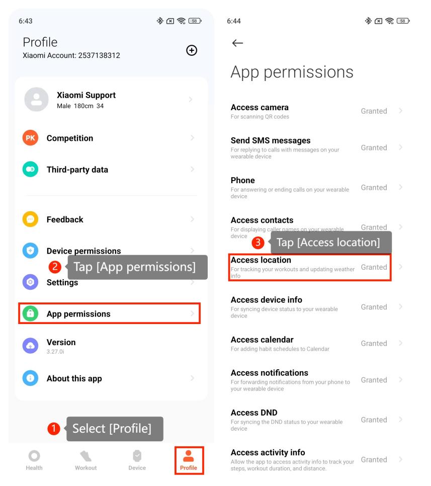 4. If the device does not support independent satellite positioning, please ensure that the app is connected to the device and open the app to obtain positioning permissions; (Mi Fitness app >> select [Profile] >> tap [App permissions] >> tap the [Access location] which needs to allow access)