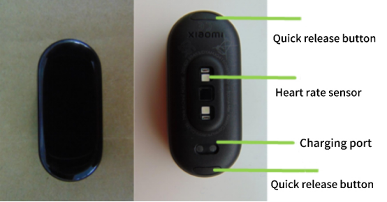 The regular version of the Xiaomi Smart Band 9 has dimensions of 46.6 × 21.6 × 11mm, with a weight of 27g (including the band). It features a 1.62-inch AMOLED display with a resolution of 192*490 pixels and a refresh rate of up to 60Hz. Its brightness is infinitely adjustable, reaching a maximum of 1200 nits, and the band supports automatic brightness adjustment. The PPI of the Xiaomi Smart Band 9 is 326, providing a sharp and clear visual experience. Additionally, It comes with a standard strap width of 20mm. The strap length is adjustable, ranging from 135mm to 210mm. The appearance of the Xiaomi Smart Band 9 series is as follows: The Xiaomi Smart Band 9 features a cover plate made of 2D glass and a shell constructed from an aluminum alloy frame with veneer. On the back panel of the Xiaomi Smart Band 9, there are two quick-release buttons(which allow for easy swapping and installation of different bands without the need for any tools), a heart rate sensor(which can help people better manage and improve their health and lifestyle), and a charging port.