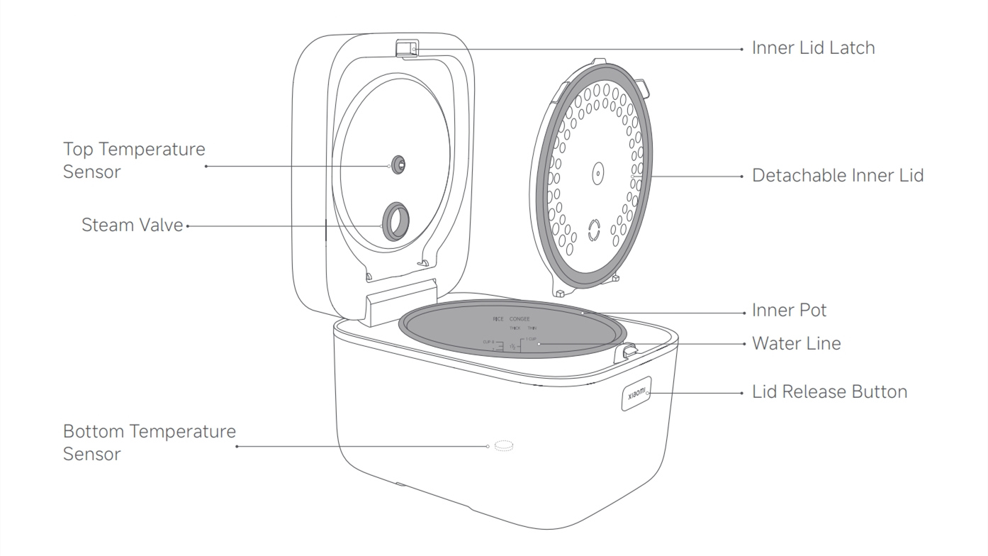 The main structure includes the top temperature sensor, steam valve, inner lid latch, detachable inner lid, inner pot, water line, lid release button and bottom temperature sensor. Note: Illustrations of the product, accessories, and user interface are for reference purposes only. There will be slight differences between the actual product and the illustrations. Please refer to the actual product.