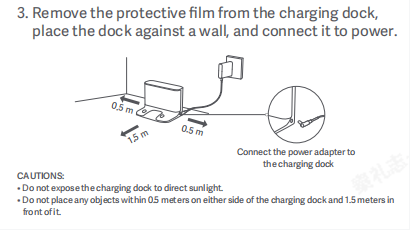Place the Charging Dock against the wall on level ground, ensure there is more than 0.5m of space on both sides of the Charging Dock, and connect the plug to the power socket. To give you a better experience using the Mi Home/Xiaomi Home APP, please place the Charging Dock within Wi-Fi coverage. 1. Install the Charging Dock in an open location with a good Wi-Fi signal; 2. Install the power cord to the Charging Dock and connect the power supply. Please refer to the following steps and picture: 1. Remove the protective film from the Charging Dock; 2. Place the dock against a wall, and connect it to power; 3. Connect the power adapter to the Charging Dock. Note: 1. Do not expose the charging dock to direct sunlight; 2. Do not place any objects within 0.5 meters on either side of the charging dock and 1.5 meters in front of it; 3. Before use, place the main unit on the Charging Dock, and the main unit will automatically turn on and charge; 4. After fully charged, the main unit indicator stays on for 10 minutes and then goes off.
