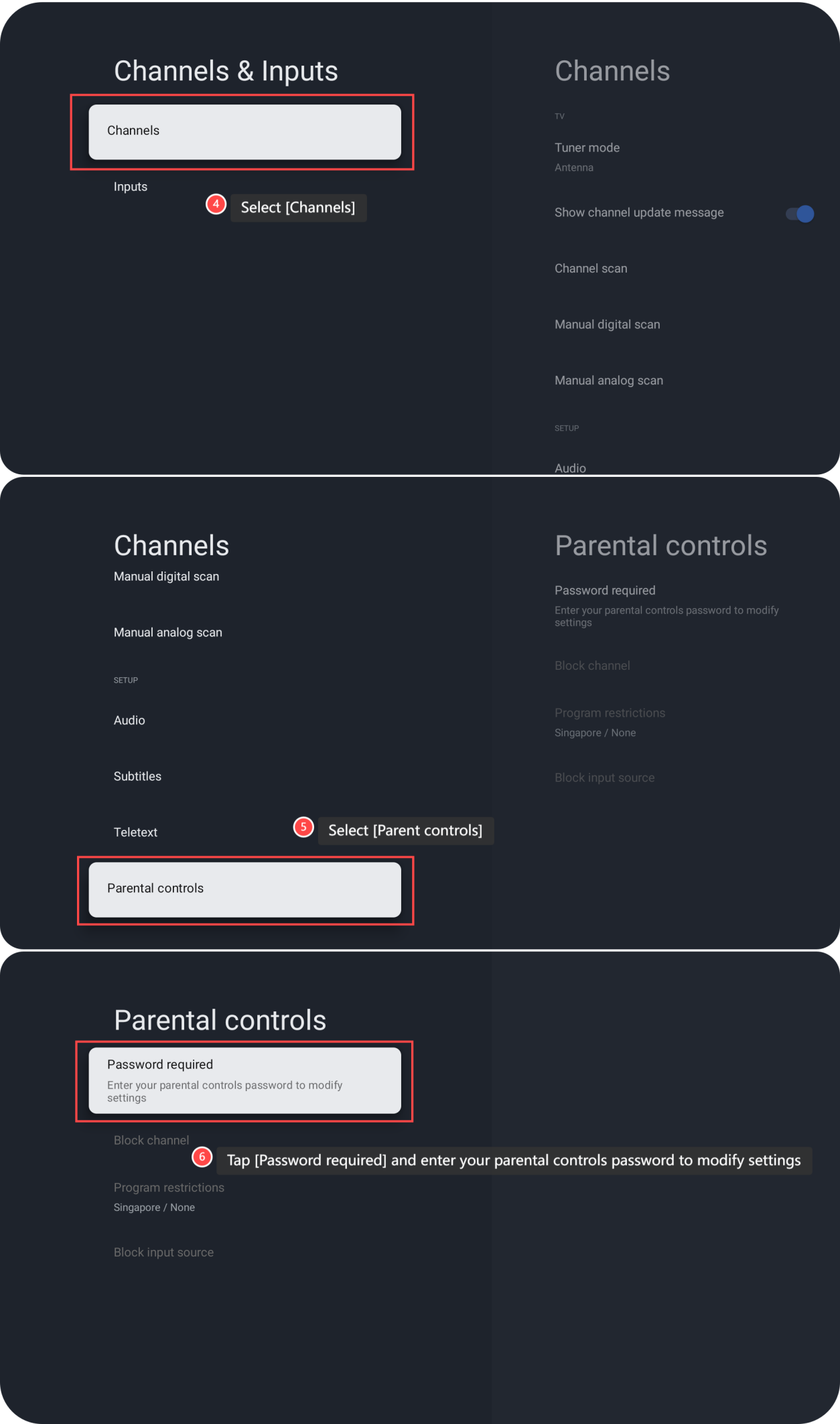 The Xiaomi TV A 55 2025's parental controls function provides powerful management tools to help parents control what their children watch and ensure their entertainment experience is safe and appropriate. Parents can flexibly set and limit TV usage with the following features: 1. Block channel: Parents can choose to block specific TV channels to prevent their children from accessing and watching content that is not appropriate for their age. This way, children can only access channels that parents allow, ensuring that their viewing content is safe and appropriate; 2. Program restrictions: Parents can set access restrictions based on program type or content rating. This feature allows parents to prevent their children from watching programs that contain adult content, violence, or other programs that are not suitable for children; 3. Block input source: Parents can block specific input sources to prevent children from using external devices or connecting content sources such as game consoles that do not meet parental requirements. This helps to further control children's content access and avoid exposure to unscreened content. To control access to adult content on the TV, there are two methods for your reference: Method 1: 1. Open [Settings]; 2. Select [All settings]; 3. Tap [Channels & Inputs]; 4. Select [Channels]; 5. Select [Parent controls]; 6. Tap [Password required] and enter your parental controls password to modify settings. Method 2: 1. Open [Settings]; 2. Select [Switch account]; 3. Tap [Add account]; 4. Select [Add a kid]; 5. Tap [Get started]; 6. Tap [Add a kid] and take the steps as prompts. Note: For the first time to use the parental controls function, you need to set a password.