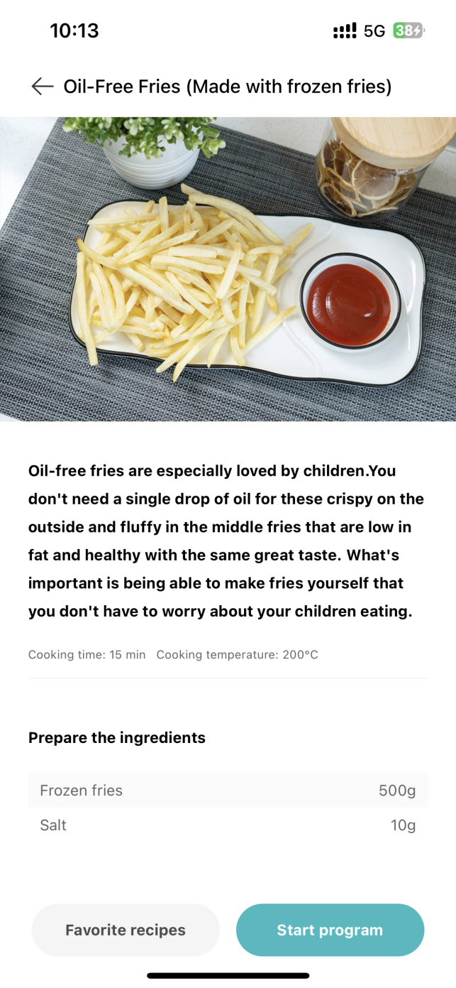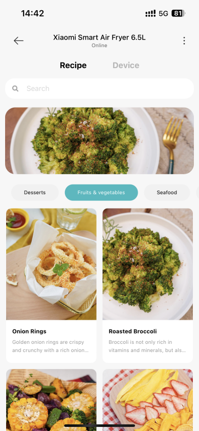 42.Q: Does Xiaomi Smart Air Fryer 6.5L have a cloud recipe? A: Yes, the Mi Home App has recipes for different ingredients to choose from. Tips: 1.Please choose cooking recipes according to the characteristics of different ingredients, please refer to the millet APP recipes to use; APP recipe, the ingredient formula has been adjusted and matched for many times, please use the recipe in the APP.