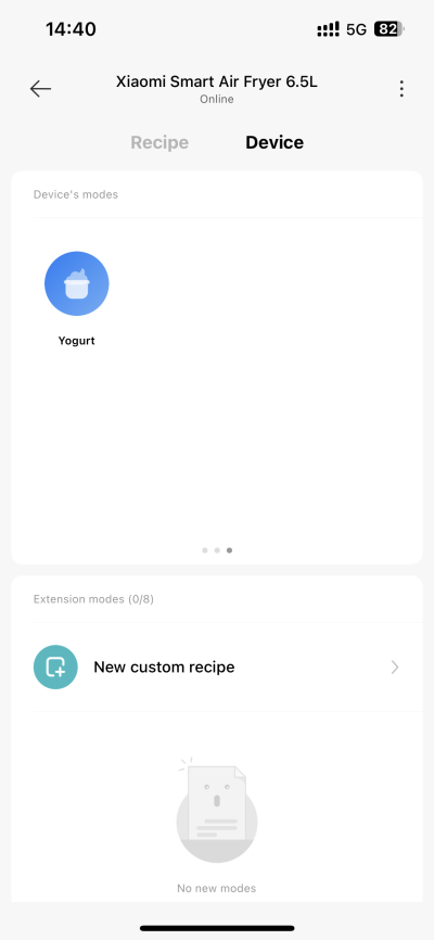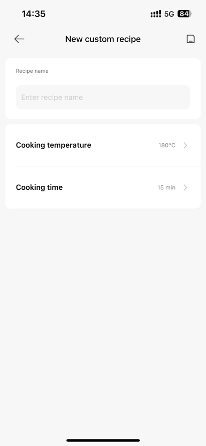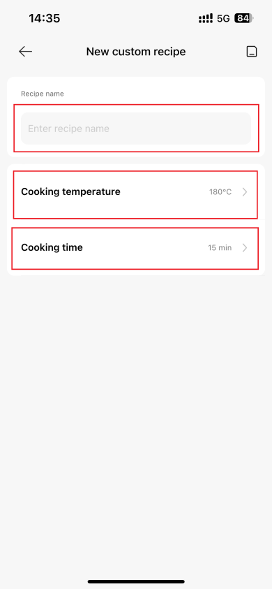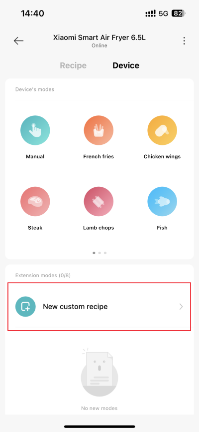 4.Q: Does Xiaomi Smart Air Fryer 6.5L support custom recipes? A: Custom recipes are supported. The method of customizing recipes is as follows: After selecting the custom recipe on the APP, set the recipe name, select the cooking method, set the cooking temperature and duration, and then save it. Note: The mode name can be customized, and the picture is named New for reference.