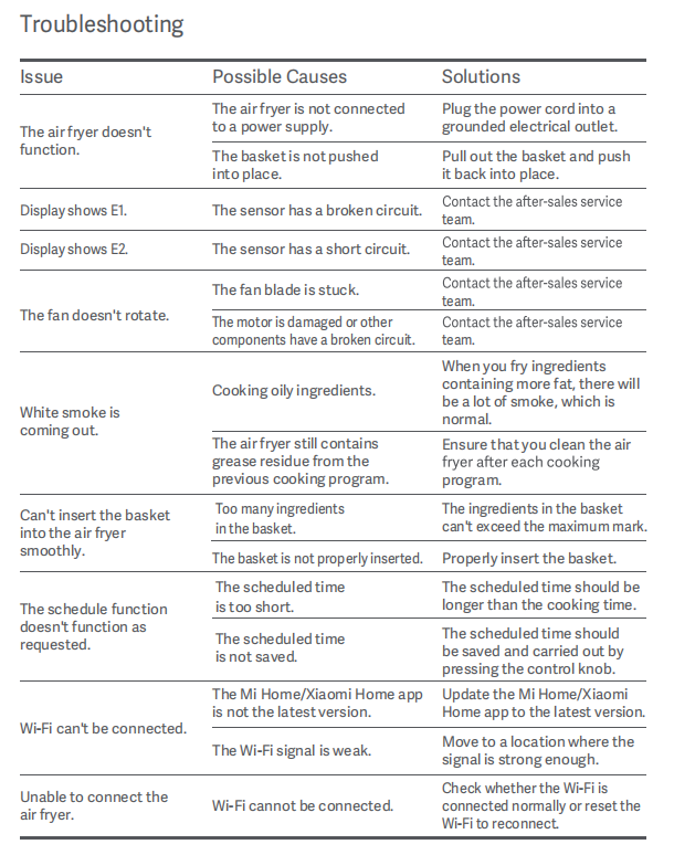 15.Q: Troubleshooting for Xiaomi Smart Air Fryer 6.5L A: