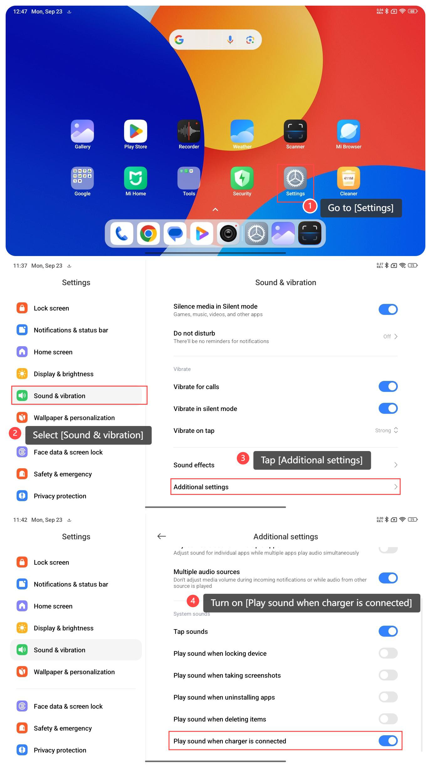 Making the Redmi Pad SE 8.7 4G play sound when charger is connected can serve as audible confirmation that the charger has been successfully connected to your tablet. This can be useful to ensure that the charging process has started. To makeyour tablet play sound when charger is connected, please refer to the following steps: 1. Go to [Settings]; 2. Select [Sound & vibration]; 3. Tap [Additional settings]; 4. Turn on [Play sound when charger is connected]. Note: 1. If there’s an issue with the charging cable or connection, an audible notification can draw attention to the problem. This can help you identify and address charging issues promptly, such as a loose connection or a faulty cable; 2. Ensure that the device is not in Do not disturb mode, which can mute system sounds, including the charging sound.