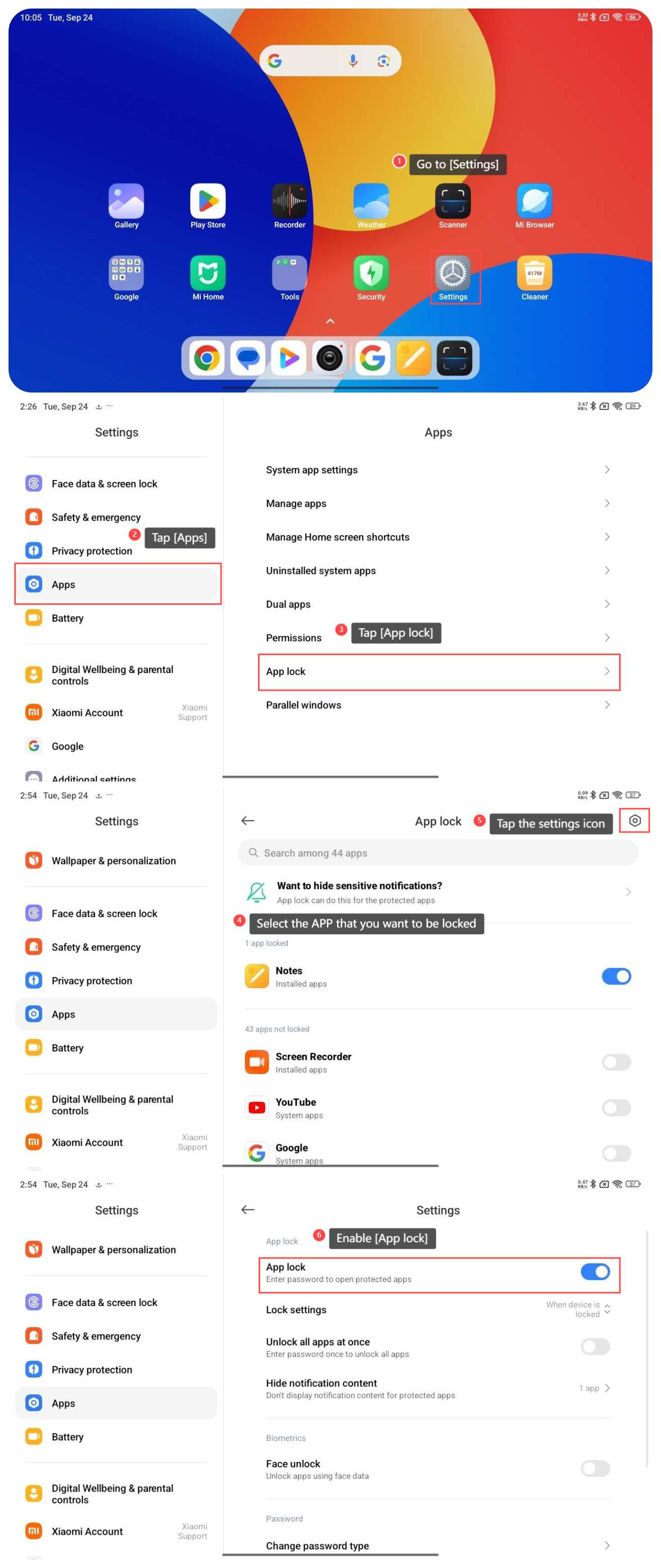 6. Enable [App lock] and you need to enter password to open protected APPs.